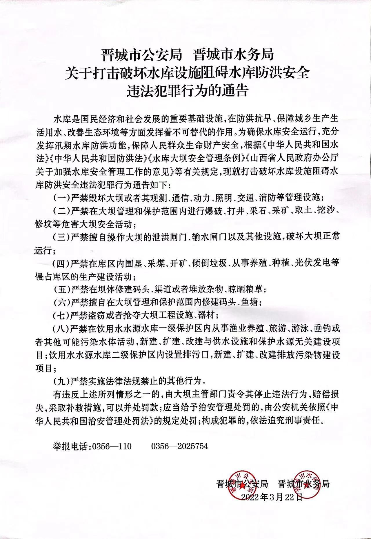 水库是国民经济和社会发展的重要基础设施,在防洪抗旱、保障城乡生产生活用水、改善生态环境等方面发挥着不可替代的作用。为确保水库安全运行,充分发挥汛期水库防洪功能,保障人民群众生命财产安全,根据《中华人民共和国水法》《中华人民共和国防洪法》《水库大坝安全管理条例》《山西省人民政府办公厅关于加强水库安全管理工作的意见》等有关规定,现就打击破坏水库设施阻碍水库防洪安全违法犯罪行为通告如下: